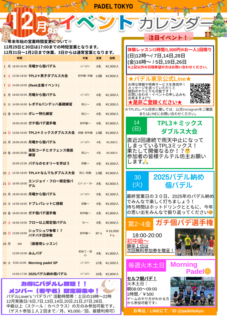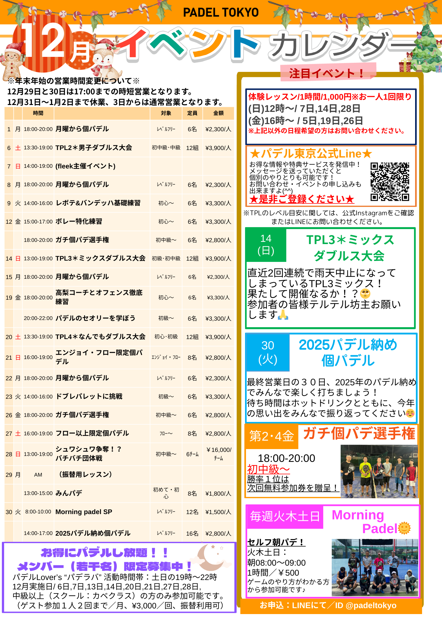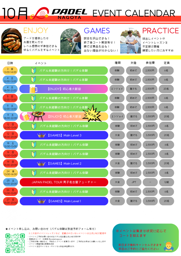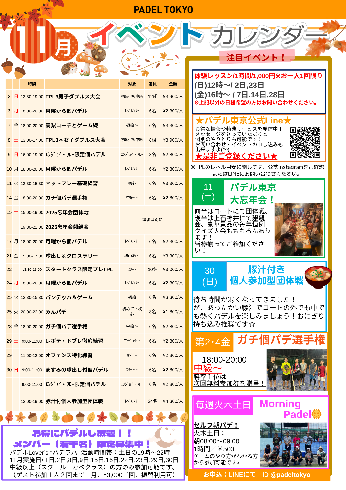 大人気イベントの肉パデ(BBQ&パデル)から大会までパデル未経験者から上級者まで楽しんでいだけるよう様々なイベントを企画しております。詳しくは各施設のイベントスケジュールをご覧ください。